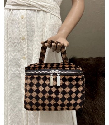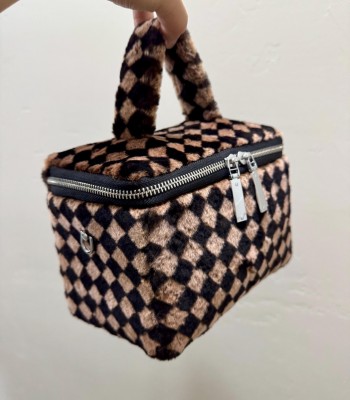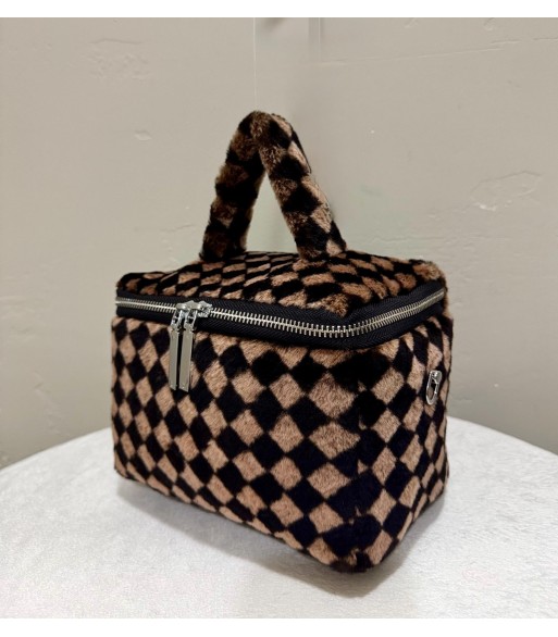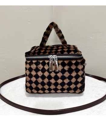 This bag is full of personality and fashion. The bag body is made of plush material, with a black and brown checkerboard pattern. The classic plaid elements are matched with soft and fluffy plush texture, which is retro and cute. The top is a plush handle of the same material, which feels comfortable. The zipper opening and closing design is convenient for taking items, and the metal zipper head is full of texture. It is equipped with a dark brown leather shoulder strap, which can be carried by hand or cross-body to meet different usage needs, and it is both practical and beautiful.