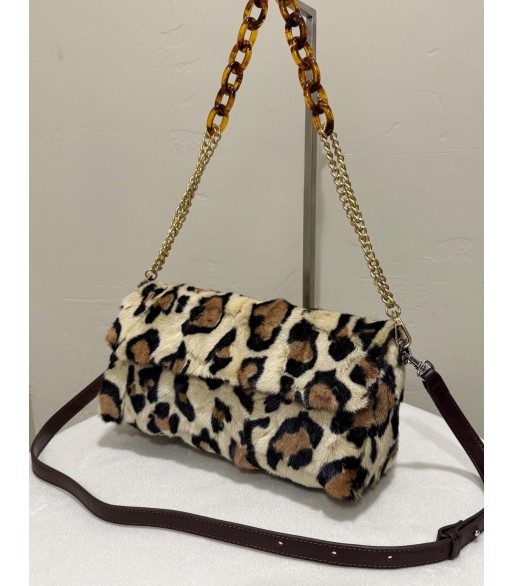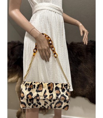 This handbag cleverly combines wildness and fashion. The bag body is made of leopard plush material, with classic brown and black spots and soft suede, exuding a strong retro and modern atmosphere. The unique chain shoulder strap design is made of amber acrylic chain links and gold metal chains, which collide with unique fashion sparks, adding layering and personality charm to the bag. It is a fashionable tool that attracts attention on the street and shines at parties.
