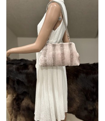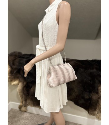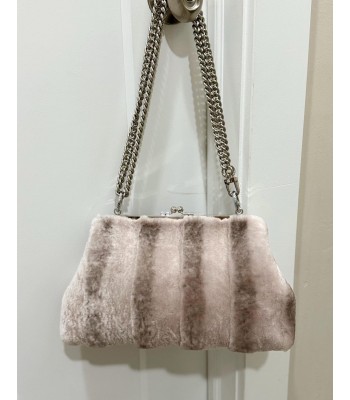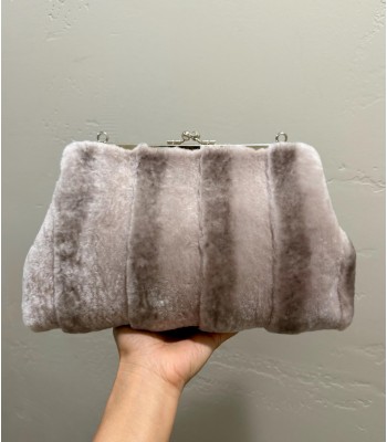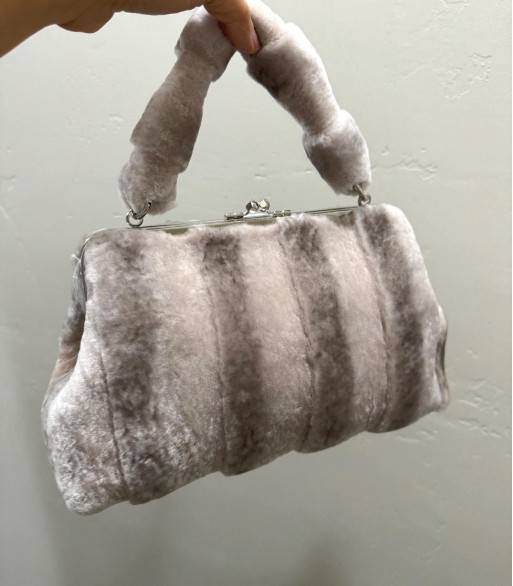 This clutch features a plush exterior in a light gray and white color scheme with a soft gradient effect, creating a warm and elegant feel. The rectangular shape and metal hinged closure add a refined touch. A top handle makes it easy to carry, and its compact size makes it easy to carry, making it a stylish and practical piece.
