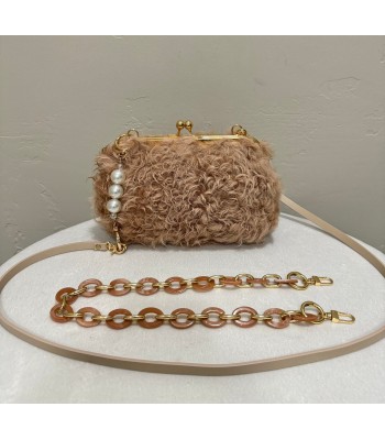 This bag is made of light brown curly plush, which is fluffy and rich in texture, as if the soft fallen leaves in autumn are kneaded into the design, bringing a sense of warmth and relaxation. The top is opened and closed with a delicate golden hinge, and the coldness of the metal collides with the softness of the plush. It is matched with a long leather shoulder strap in the same color, which can be worn cross-body to create a casual atmosphere. The overall style switches freely between retro elegance and daily relaxation, which is the "atmosphere" of autumn and winter wear.