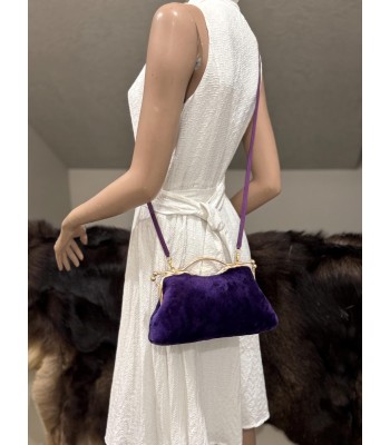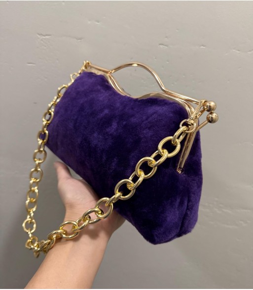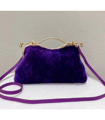 This bag is made of rich purple plush, which is delicate and smooth, exuding a noble luster like velvet, as if it condenses the mysterious violet night. The gold metal hinge design is exquisite and elegant, outlining a beautiful bag shape, matched with a long leather shoulder strap in the same color, which can be worn cross-body to create a casual atmosphere. The overall style switches freely between retro luxury and modern fashion, and it is an exquisite item that can light up the shape.